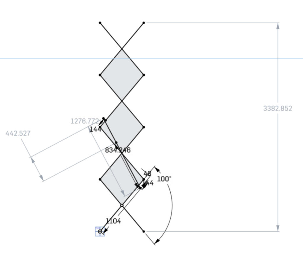This is my representation of this design using my desired sizes in an Onshape sketch. The actuator pictured can be found here and is mounted 144mm from the outside joint on either cross member which lines up with the gobilda hole pattern. I also extended the mount point above and below to help increase the attack angle even more. When retracted the chosen actuator is 32.8in or 833mm which is just a little smaller then the actuator in this design so we shouldn’t have any conflicts here. Due to the positioning of the linear actuator on the cross members after 100 degrees of rotation the actuator reaches its max retracted length of 18in. Theoretically this doesn’t matter though since 100 degrees is more than enough rotation and anymore we would begin to sacrifice stability of the lift. This allows us to reach 11ft with four stages which of course can always add more. We also will have an additional foot of vertical space taken by the sum of the drive train the rail mounting system for the top and bottom of the lift and any attachments on top so we should have no problem reach our 12ft goal.